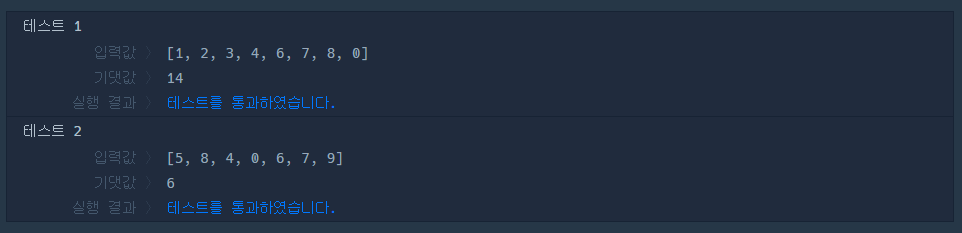 - 1, 2, 3이 numbers에 없으므로, 1 + 2 + 3 = 6을 return 해야 합니다.