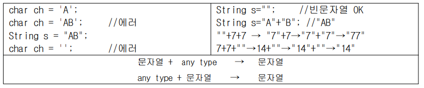 - char는 byte와 short보다 같거나 크지만 표현범위가 달라서 자동 형변환 되지 않는다.