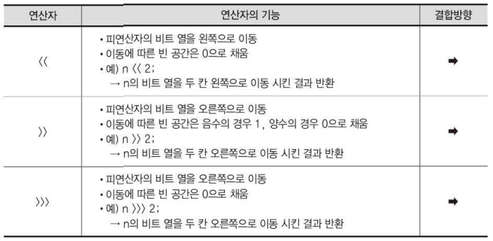 - 정수형 데이터에서만 사용가능하고 2진수로 표현했을 떄 각 자리를 오른쪽 또는 왼쪽으로 이동