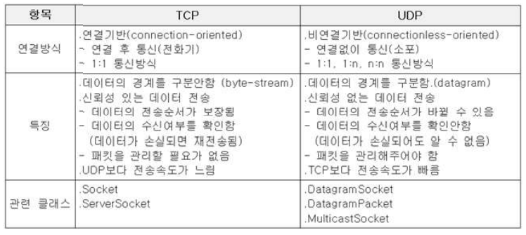 | Socket : 프로세스간의 통신을 담당하며. InputStream과 OutputStream을 가지고 있다. 이 두 스트림을 통해 프로세스간의 통신(입출력)이 이루어진다. | ServerSocket : 포트와 연결(bind)되어 외부의 연결요청을 기다리다 연결요청이 들어오면 Socket을 생성해서 소켓과 소켓간의 통신이 이루어지도록 한다. 한 포트에 하난의 ServerSocket만 연결할 수 있따.(프로토콜이 다르면 같은 포트를 공유할 수 있다.) |