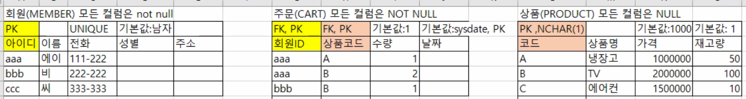 - 회원, 주문, 상품 테이블 생성 및 컬럼 데이터 입력(PK, FK, UNIQUE, NOT NULL 입력)