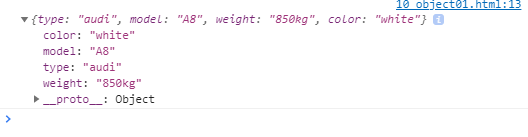 let car ={type:"audi", model:"A8", weight:"850kg",color:"white"};