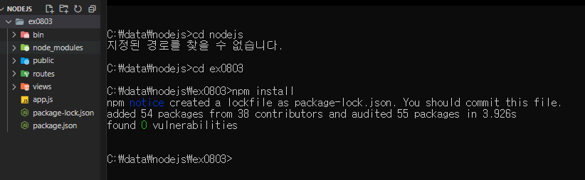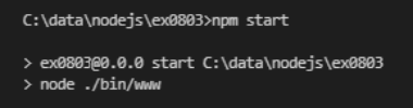 3) package.json에 추가된 모듈을 설치한다. npm install 명령어를 사용하면 package.json에 선언된 모듈이 자동으로 설치된다. 이때 명령어는 ex210803 디렉터리 아래에서 실행한다.