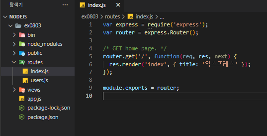 1) ex0803/routes/index.js 에서 router의 title을 Express 에서 익스프레스에서 변경해보았다.