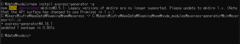 3. cmd에서 설치 경로 지정 후 npm install express-generator -g
