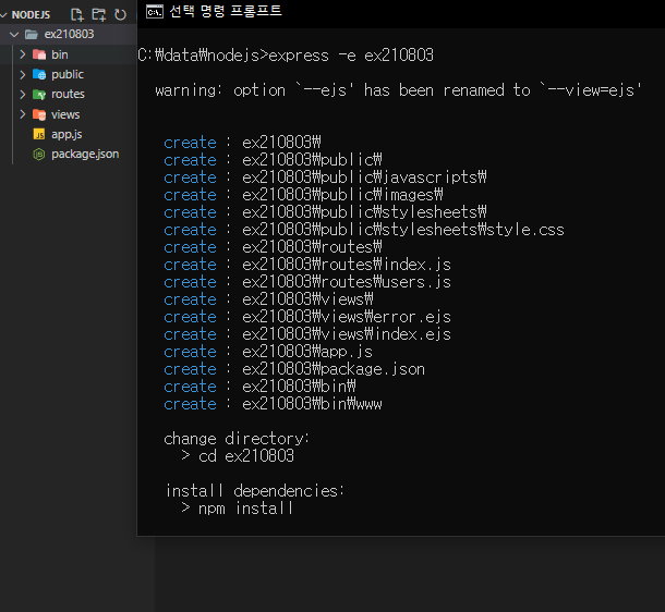 1) cmd에 express -e ex210803(임이의 프로젝트 이름) 입력