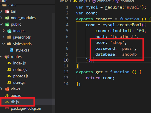 데이터베이스를 연동하는 방법은 두 가지가 있다. 첫 번째는 매번 데이터베이스의 커넥션을 얻어서 사용하는 방법이고, 두 번째는 커넥션 풀을 생성해 서 커넥션을 미리 생성한 후에 하나씩 꺼내서 사용하는 방법이다. 커넥션 생성 비용은 매우 크므로 가능하면 커넥션 풀을 사용하는 것이 좋다. 이 파 일에는 두 개의 함수가 있다. connect는 데이터베이스 커넥션 풀을 생성하는 함수이고, get은 생성한 커넥션 풀을 반환하는 함수이다. get 함수를 통해 풀을 반환받은 후에 데이터베이스에 질의를 실행할 수 있다.