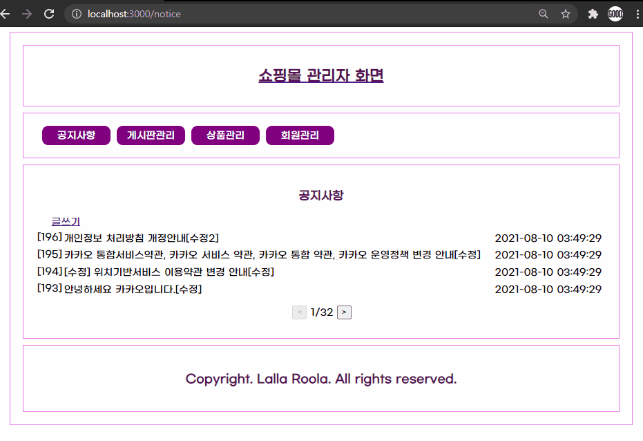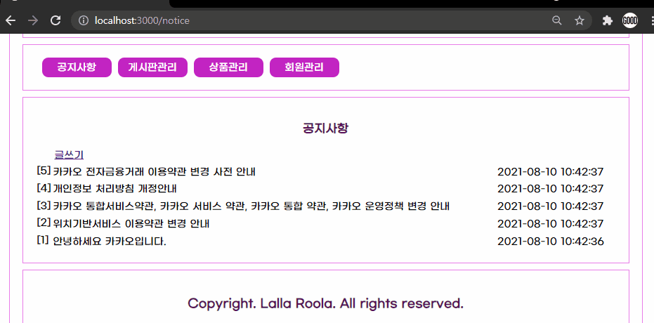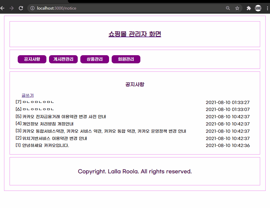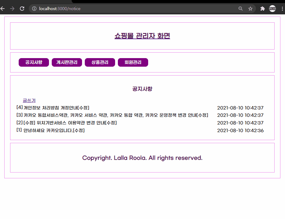 - 공지사항, 게시판관리, 상품관리, 회원관리를 위한 라우터를 만든다.
