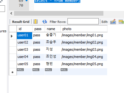 insert into member(id,pass,name,photo) values('user04','pass','조인성','/images/member/img04.png');