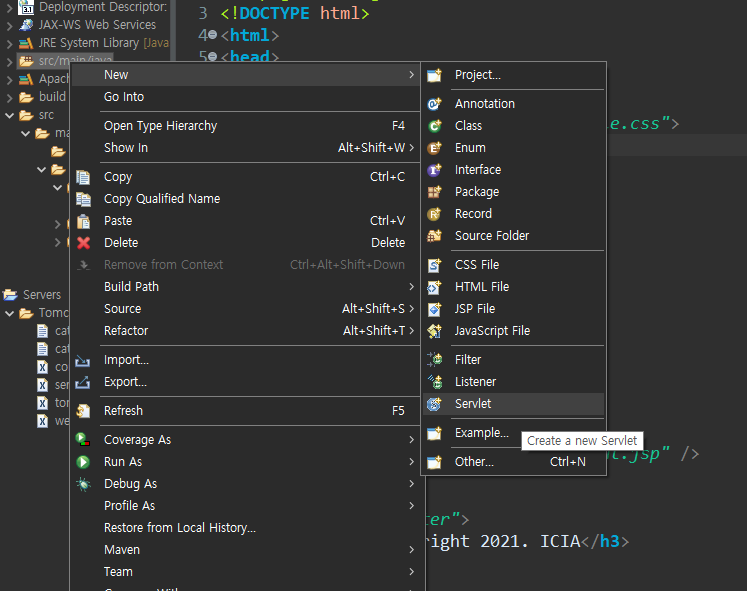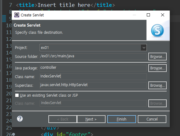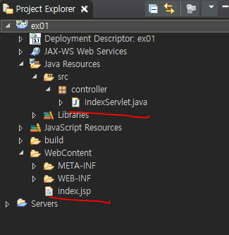 7. java 리소스>src 아래 패키지 컨트롤러, 클래스 인덱스서블릿 이라는 이름의 파일을 만든다.