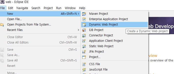1. 이클립스에서의 웹 구현을 위해서 다이나믹 웹 프로젝트를 새성한다.