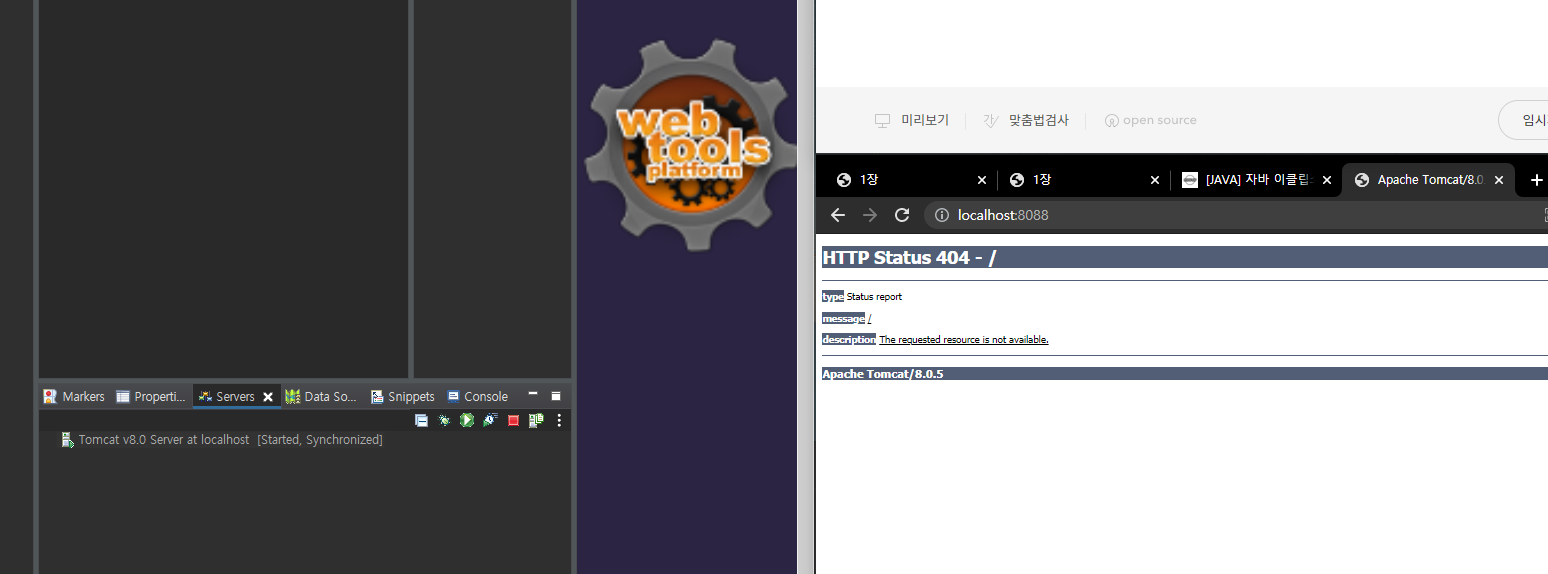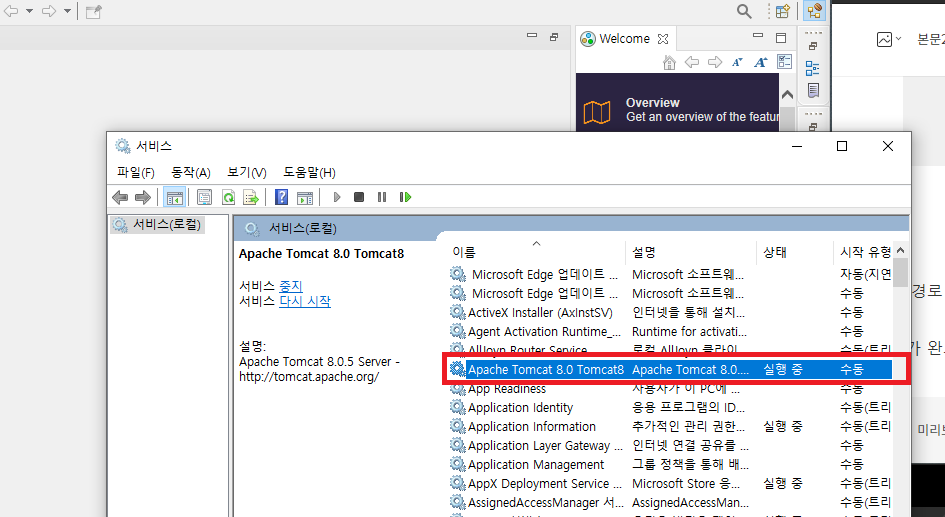 3. 설치가 완료되면 서비스를 켜서 톰켓 서버가 작동하고 있는지 확인해보자.