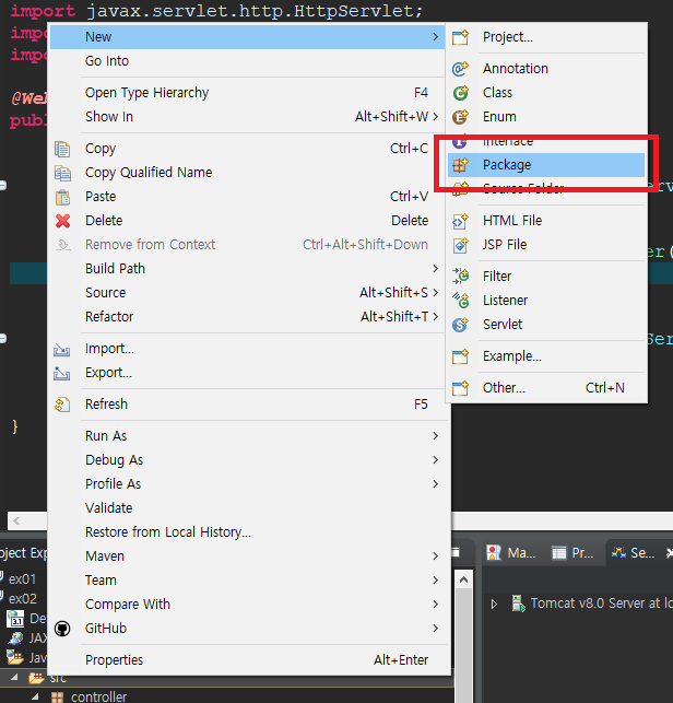 - Java Resources\src\ 에 서블릿을 만들고 패키지 이름은 controller로 하도록 하자.