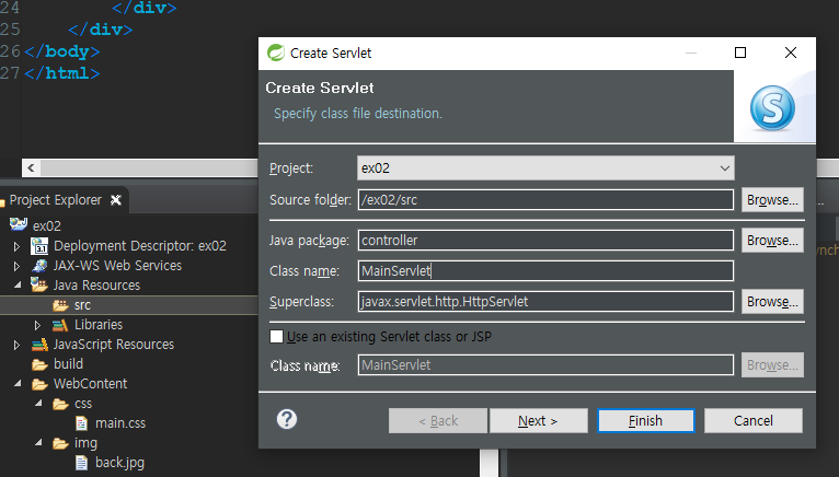 - java resources src 안에 controller를 만들어보자. 이름은 MainServlet으로 하자.