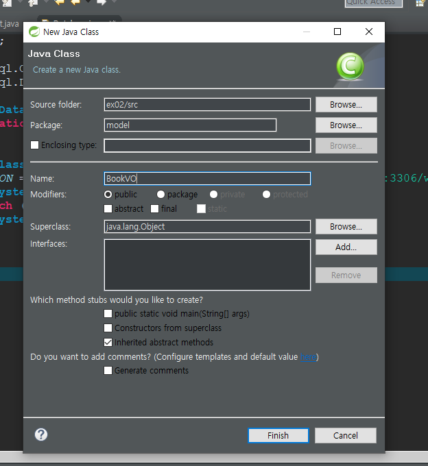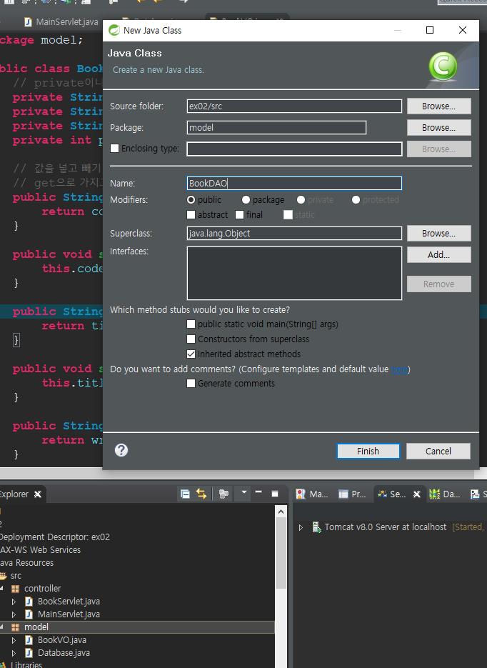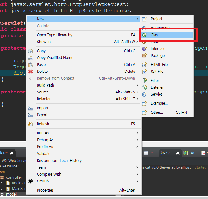 - MainServlet.java와 같은 경로에 도서관리를 위한 controller BookServlet을 만들어보자.
