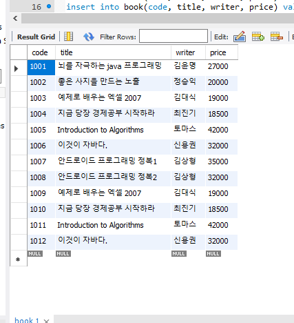 String sql = "insert into book(code, title, writer, price) values(?,?,?,?)";