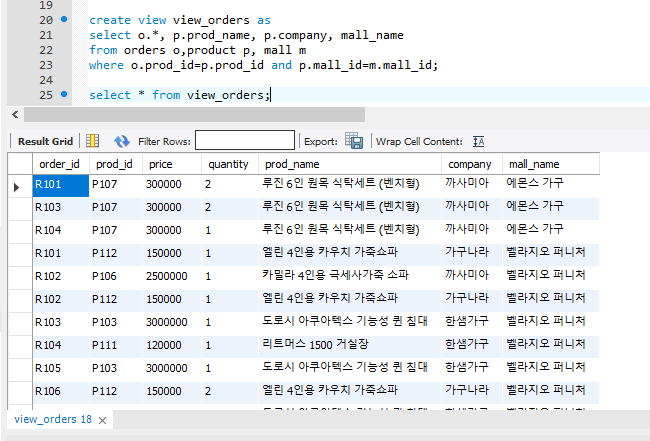 - 제품명, 제조사, 판매사의 정보가 출력될 수 있게 view_orders라는 이름의 view를 생성하겠다.