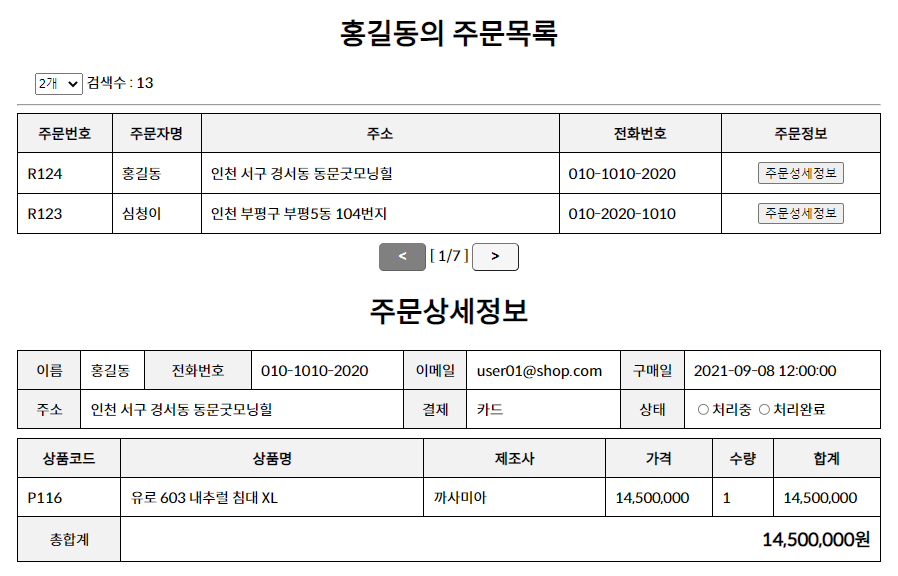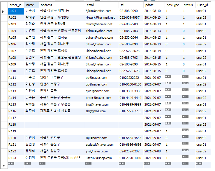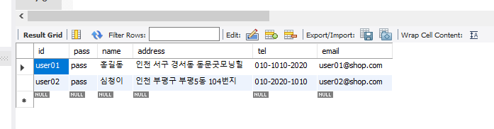 values('user02', 'pass', '심청이', '인천 부평구 부평5동 104번지', '010-2020-1010', 'user02@shop.com');