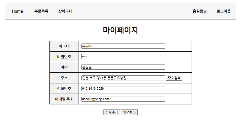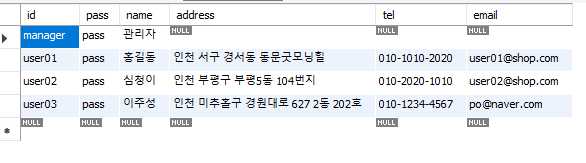 values('user01', 'pass', '홍길동', '인천 서구 경서동 동문굿모닝힐', '010-1010-2020', 'user01@shop.com');