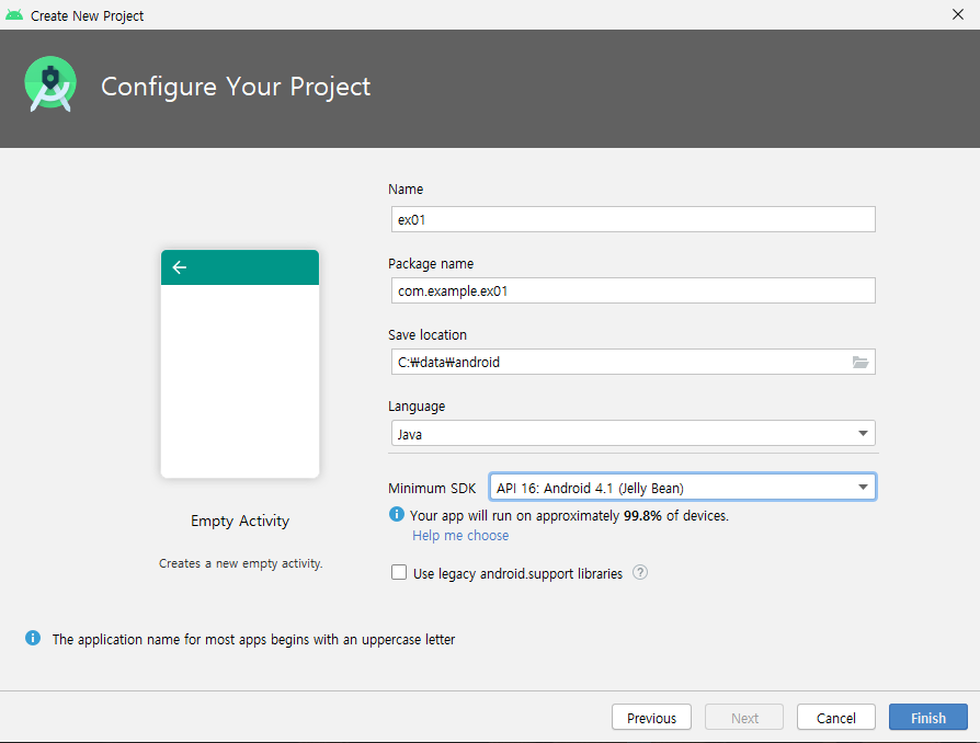 안드로이드에서는 화면 하나를 activity라고 칭하고 나는 empty로 진행하도록 하겠다.