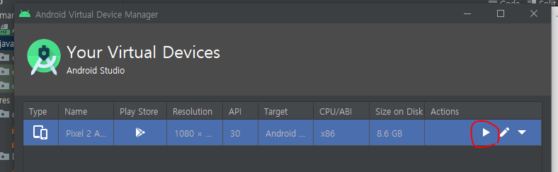 안드로이드 스튜디오에서 설치 경로 -> tools - avd(Android Virtual Device