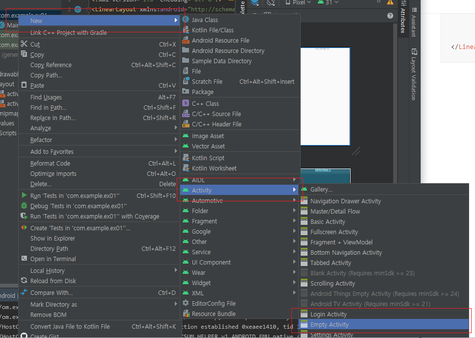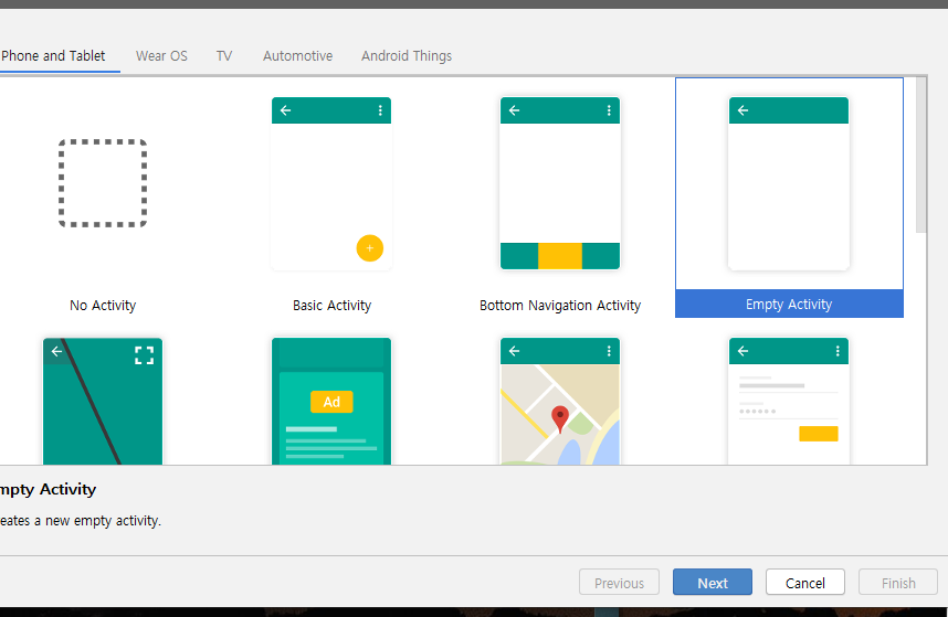안드로이드에서는 화면 하나를 activity라고 칭하고 나는 empty로 진행하도록 하겠다.
