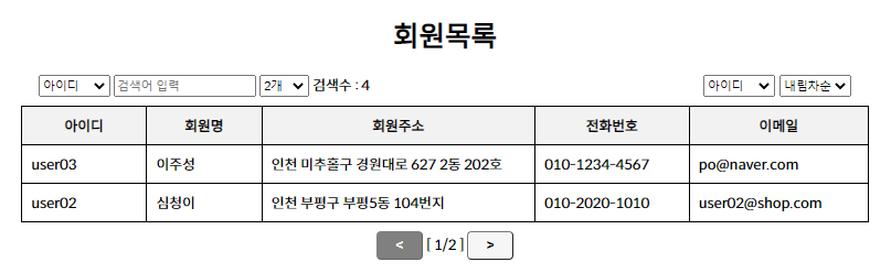 values('user02', 'pass', '심청이', '인천 부평구 부평5동 104번지', '010-2020-1010', 'user02@shop.com');