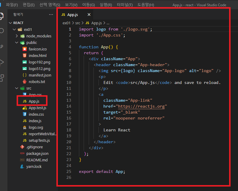 만약에 페이지를 수정하고 싶으면 App.js(C:\data\react\ex01\src\App.js)에서 수정하면 된다.