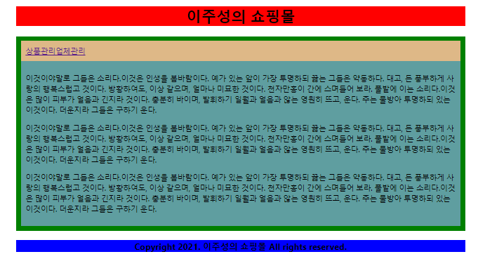 <h3>Copyright 2021. 이주성의 쇼핑몰 All rights reserved.</h3>