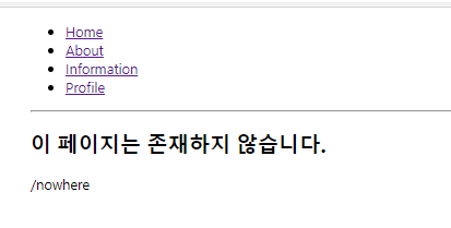 switch 컴포넌트는 여러 Route를 감싸서 그 중 일치하는 단 하나의 라우트만을 렌더링시켜 준다. Switch를 사용하면 모든 규칙과 일치하지 않 을 때 보여 줄 Not Found 페이지도 구현할 수 있다. 작성 후 존재하지 않는 페이지인 http://localhost:3000/nowhere로 접속해 보자.