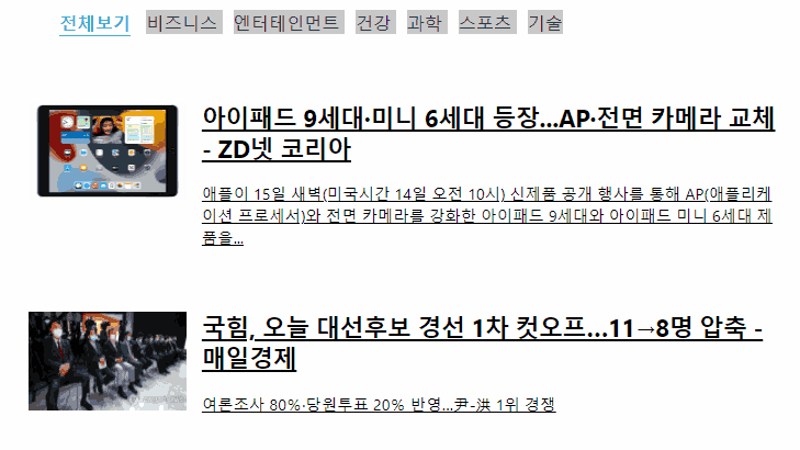 뉴스 카테고리는 비즈니스(business), 연예(Entertainment), 건강(health), 과학(Science), 스포츠(Sports), 기술(technology) 총 여 섯 개이며 화면에 보여 줄 때는 영어로 된 값을 그대로 보여 주지 않고 아래 그림처럼 한글로 보여 준 뒤 클릭했을 때는 영어 값을 사용한다.